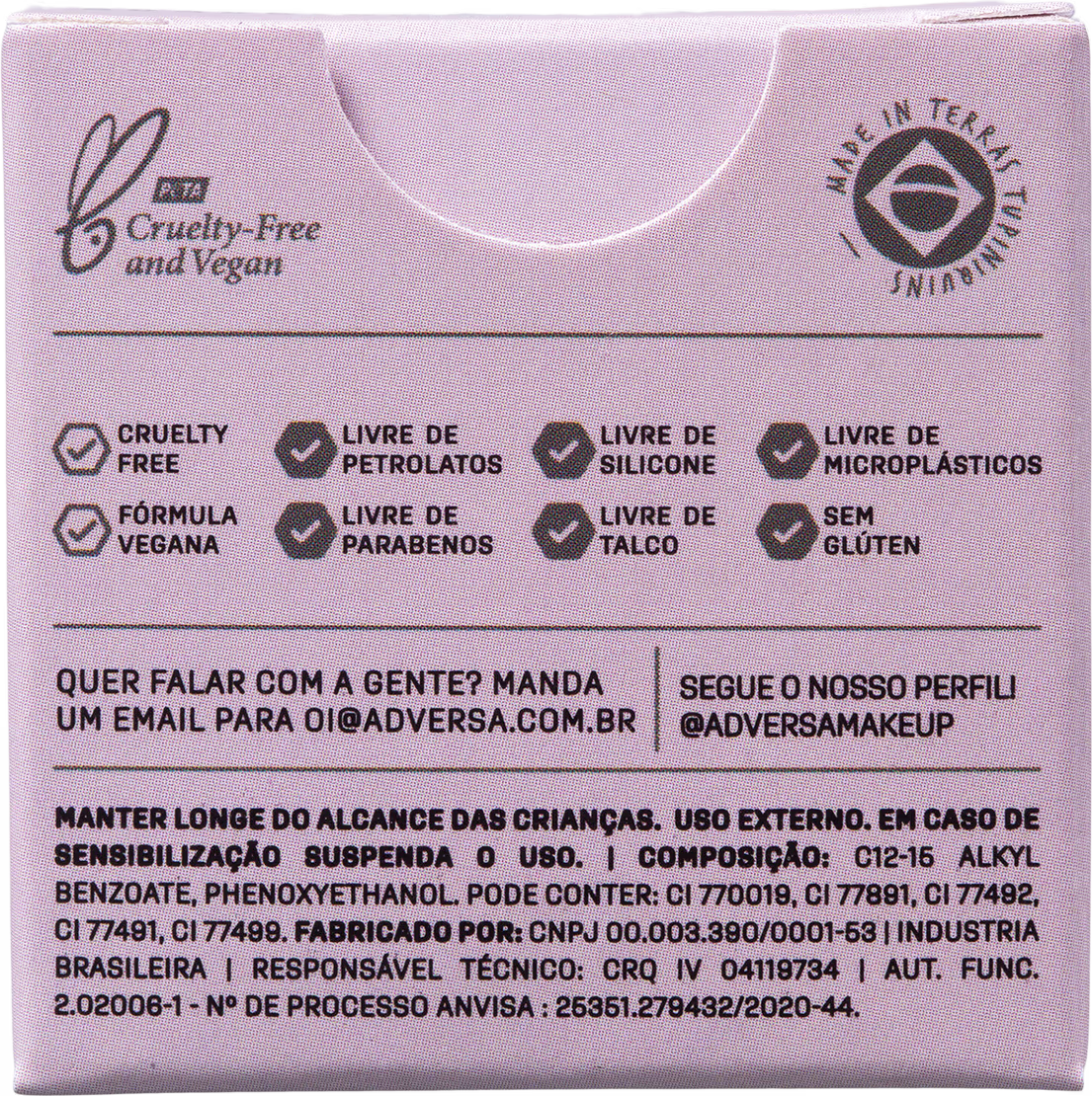Fórmula 100% vegana, cruelty free e livre de petrolatos, silicones, microplásticos, parabenos, talco e glúten.