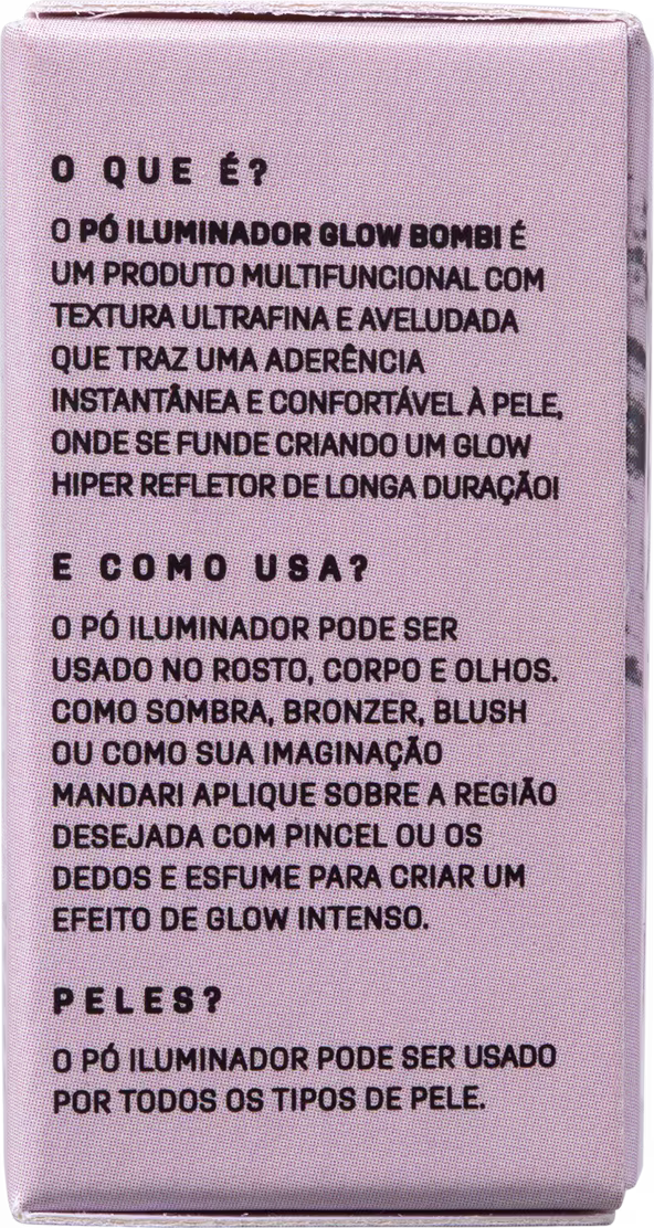 Pó iluminador multifuncional com acabamento cintilante. Adversa #GlowBomb promove aderência instantânea e brilho intenso, além de contar com textura ultrafina e aveludada.