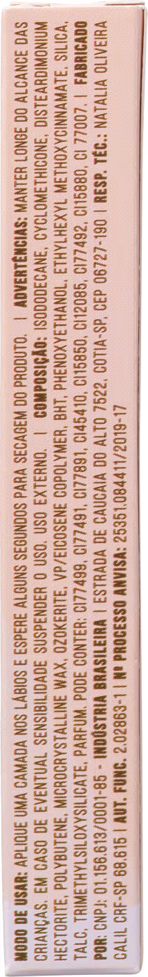 Aplique uma camada do produto na parte inferior e superior dos lábios. Espere alguns segundos para a secagem do batom, sem friccionar a boca.Se necessário, aplique mais uma camada.