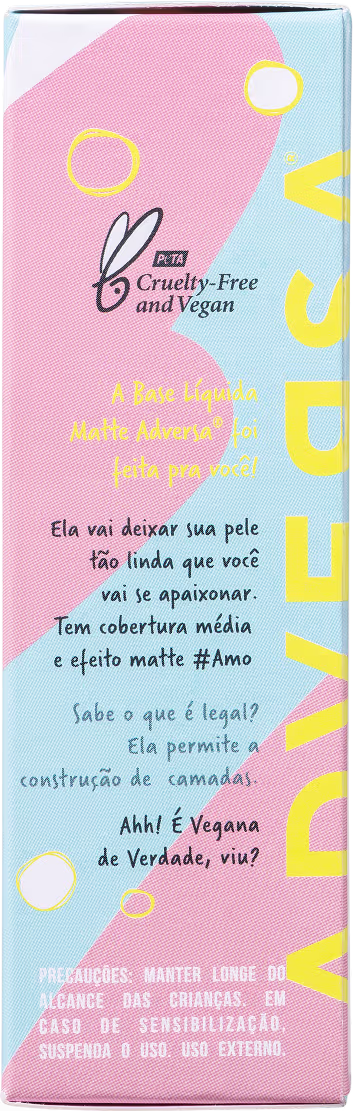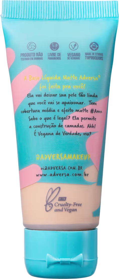 A Base Líquida ADVERSA Matte permite a construção de camadas para uma cobertura média intensa ou natural, como você desejar. Sua fórmula vegana é oil free, com textura leve e fácil aplicação para um resultado fantástico. Além disso, é livre de parabenos e sem crueldade animal!