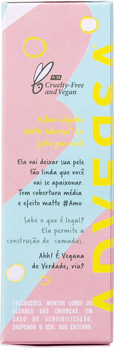 A Base Líquida ADVERSA Matte permite a construção de camadas para uma cobertura média intensa ou natural, como você desejar. Sua fórmula vegana é oil free, com textura leve e fácil aplicação para um resultado fantástico. Além disso, é livre de parabenos e sem crueldade animal!