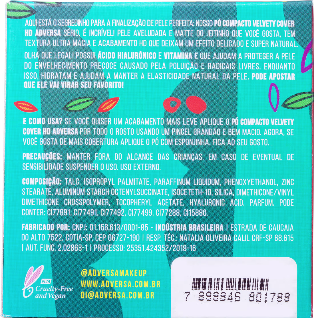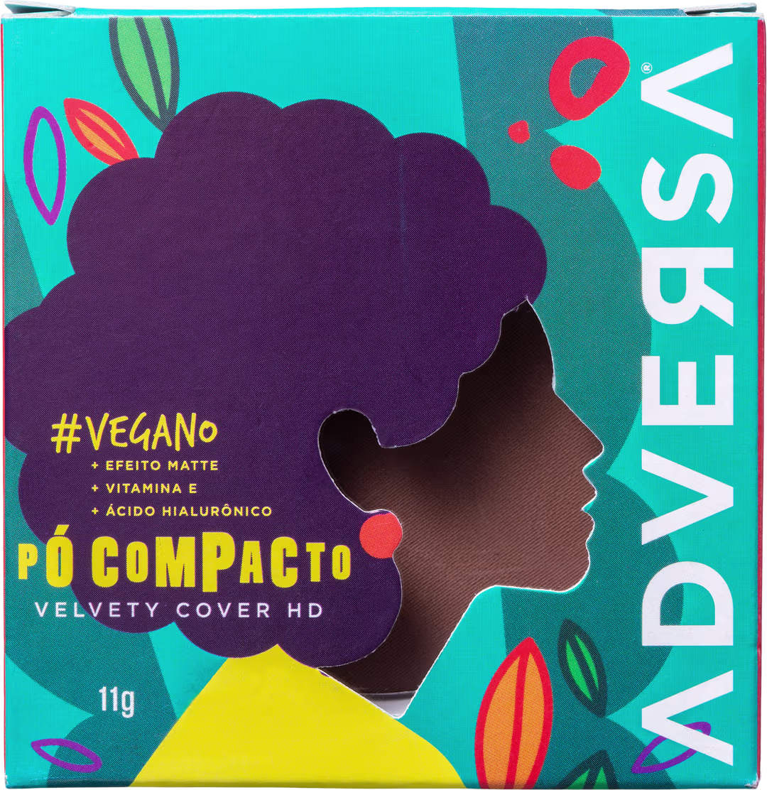 O Pó Compacto Adversa Velvety Cover HD Vegano conta com textura ultra macia e efeito HD, que proporcionam cobertura natural e toque aveludado. Além disso, possui ativos como a Vitamina E responsável por proteger a pele dos danos causados pela poluição e radicais livres e Ácido Hialurônico, que auxilia na prevenção do envelhecimento precoce enquanto hidrata e ajuda a manter a elasticidade. Assim, sua maquiagem vai ficar poderosa e intacta e a pele impecável.