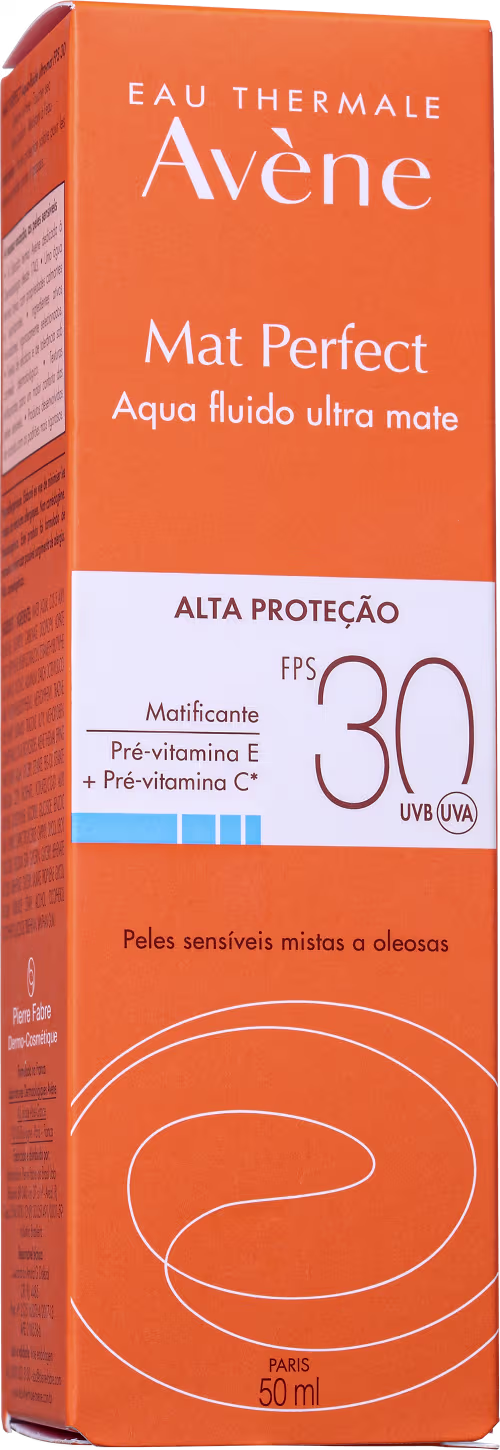 O Protetor Solar Avène Mat Perfect Aqua Fluido FPS 30 protege dos raios UVA, UVB e luz visível, além de proporcionar uma sensação de pele limpa e fresca durante todo o dia. Também contém ação antioxidante e previne o envelhecimento precoce.