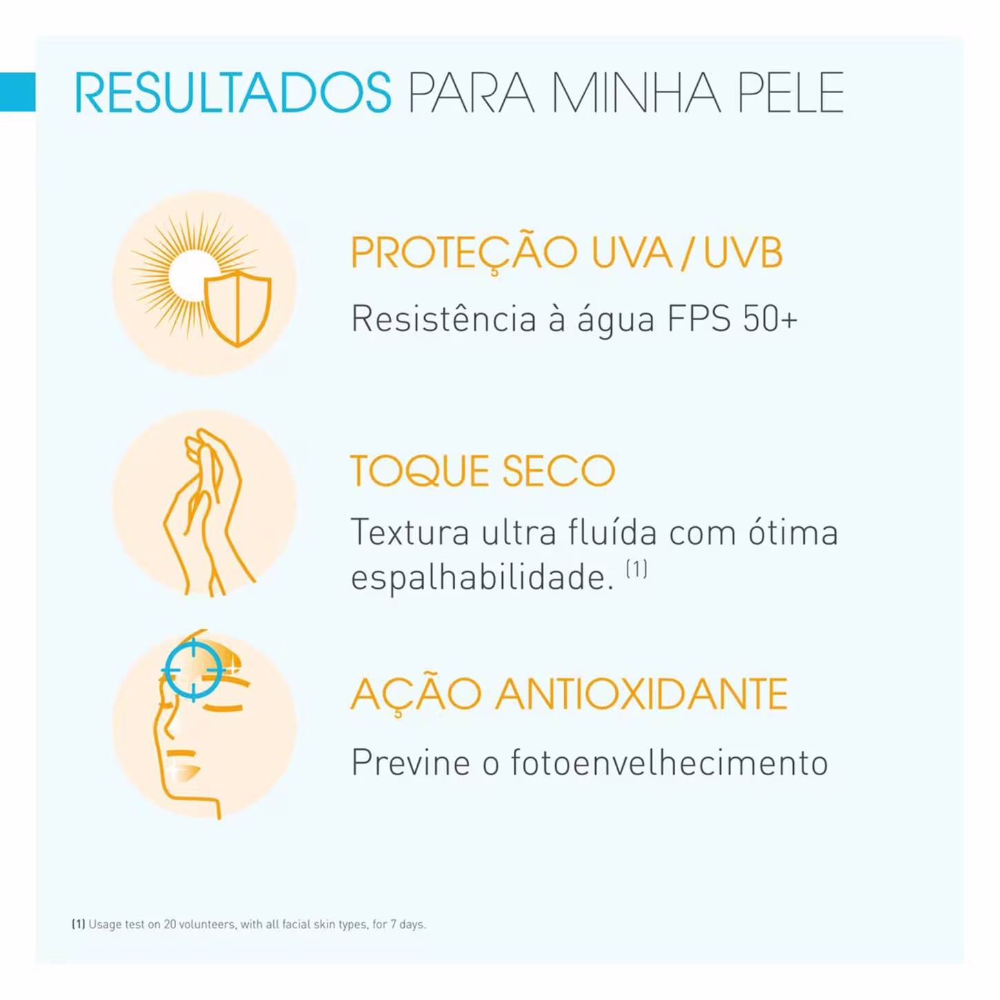 A textura ultra fluida é de rápida absorção e tem efeito invisível na pele, sem deixar marcas brancas. Formulação não comedogênica e livre perfumes, óleos ou parabenos. Embalagem com bico dosador, para maior higiene e menor desperdício.