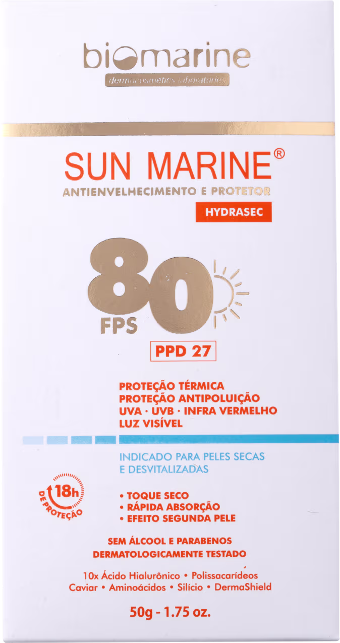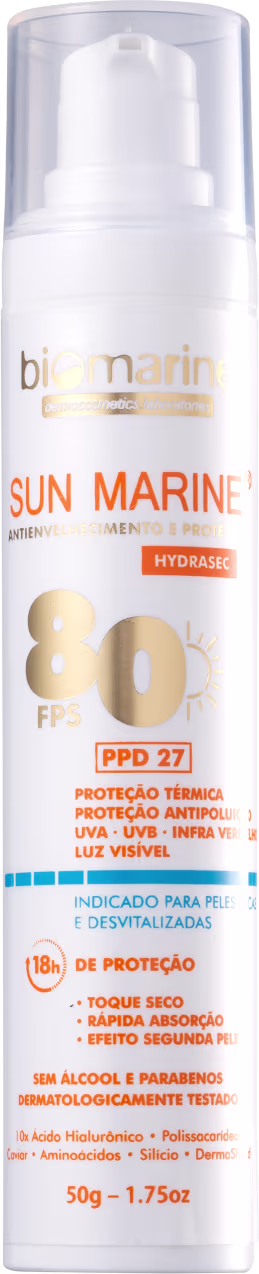 Protetor solar facial para todos os tipos de pele. Biomarine Sun Marine FPS 80 Protetor Solar Facial possui fórmula altamente protetora contra radiações variadas, como UVA, UVB, infravermelho e luz visível, além de prevenir os danos causados pela poluição.