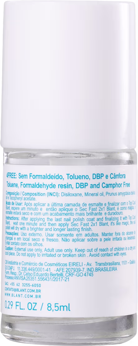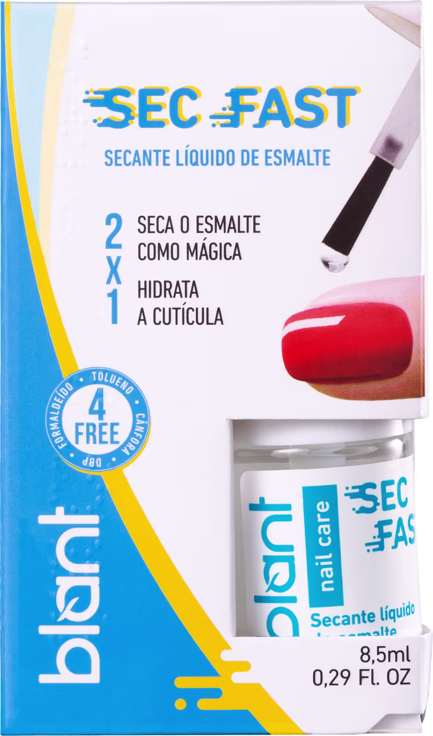 Blant Sec Fast 2x1 traz uma fórmula transparente e não oleosa, que hidrata a cutícula e promove uma película protetora, garantindo um acabamento mais brilhante e duradouro.