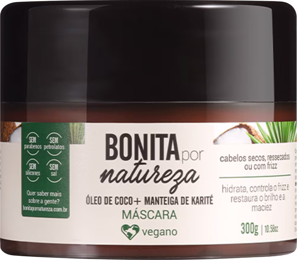 Máscara Capilar Bonita por Natureza Coco combate o frizz, reduz as pontas duplas e ainda proporciona luminosidade duradoura ao mesmo tempo que sela as cutículas. Sua composição é 100% vegana e não testada em animais.