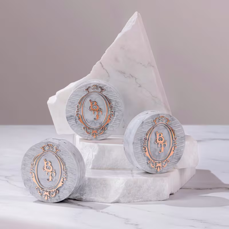 A linha BT Marble, de Bruna Tavares, foi criada com a intenção de capturar a elegância do mármore e os efeitos visuais do acabamento natural. Ela oferece um portfólio com opções que incluem sombras, gloss, hidratante iluminador e um produto versátil que pode ser usado como sombra, iluminador e como um toque final nos lábios.