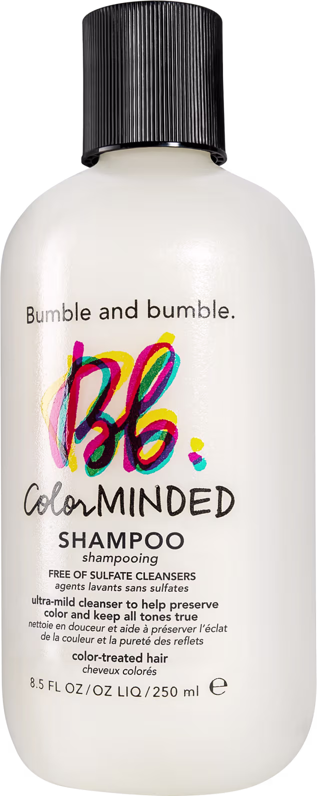 Shampoo Bumble and bumble Color Minded limpa suavemente, repara a cutícula danificada e proporciona a hidratação necessária aos seus fios. Ideal para evitar o desbotamento precoce da coloração e garantir brilho intenso.