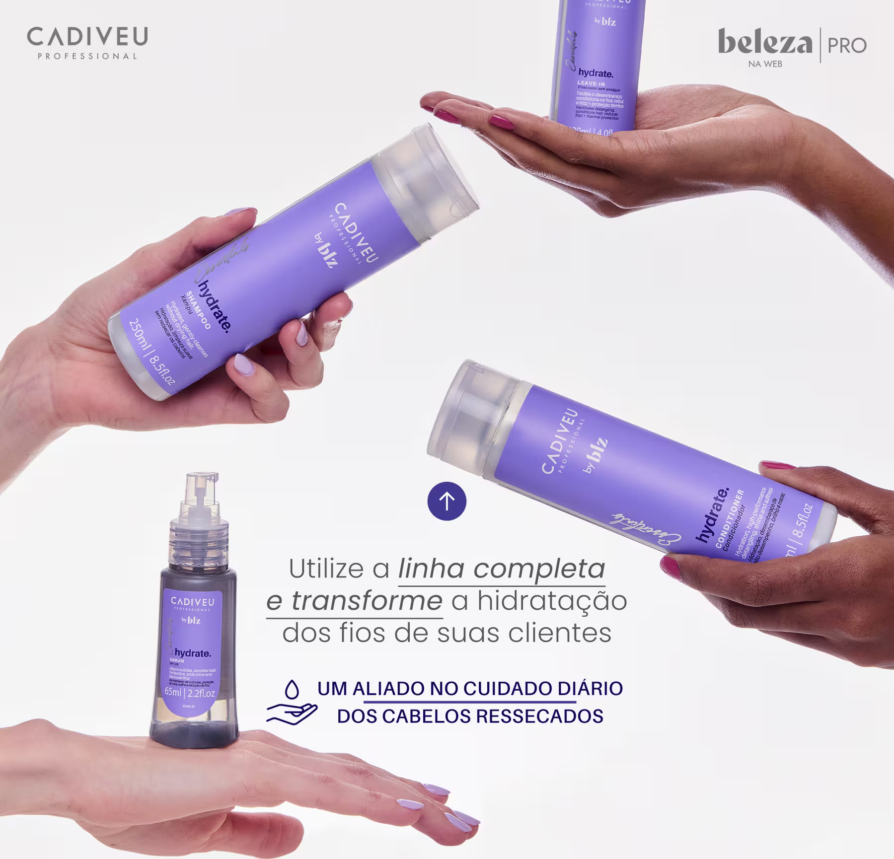 Hydrate, de Cadiveu Professional, foi especialmente desenvolvida para combater o ressecamento das fibras capilares. Graças à sua fórmula enriquecida com Pantenol (Vitamina B5), possui uma poderosa capacidade de reter a umidade e manter os fios hidratados por mais tempo. Além de restaurar a maciez, sua fórmula ajuda a prevenir pontas duplas e facilita o desembaraço, garantindo cabelos mais saudáveis, maleáveis e com toque sedoso.