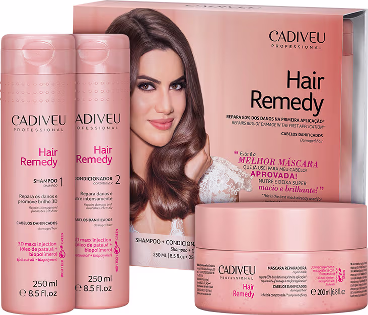 Kit de tratamento completo para cabelos danificados. Cadiveu Professional Hair Remedy nutre e revitaliza para fios macios, soltos e brilhantes.