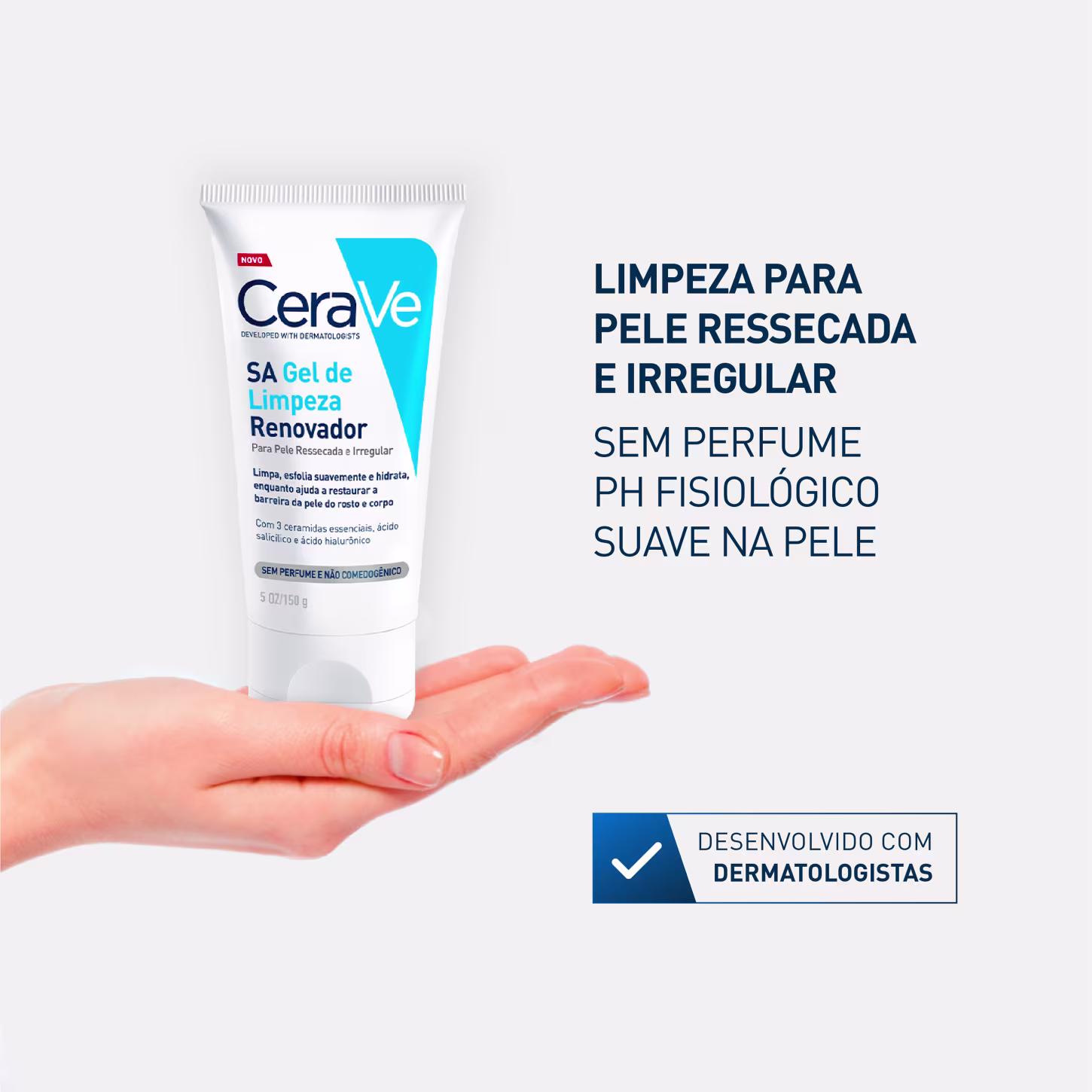 Gel de limpeza para pele ressecada e irregular. CeraVe SA Renovador limpa, elimina as células mortas e oferece suave esfoliação.