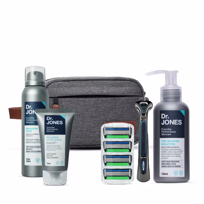 Este combo completo contém o Nécessaire Grafite, Cabo The Razor, Kit Recargas The Razor 6, Espuma Precision Foam, Balm The Shaving Solution e Gel Pós-Barba Recharge. Oferece todas as etapas para um barbear impecável: preparação, corte preciso e tratamento pós-barba. A vantagem é poder escolher entre a proteção da espuma ou a precisão do balm, finalizando com um gel que cicatriza e energiza a pele.