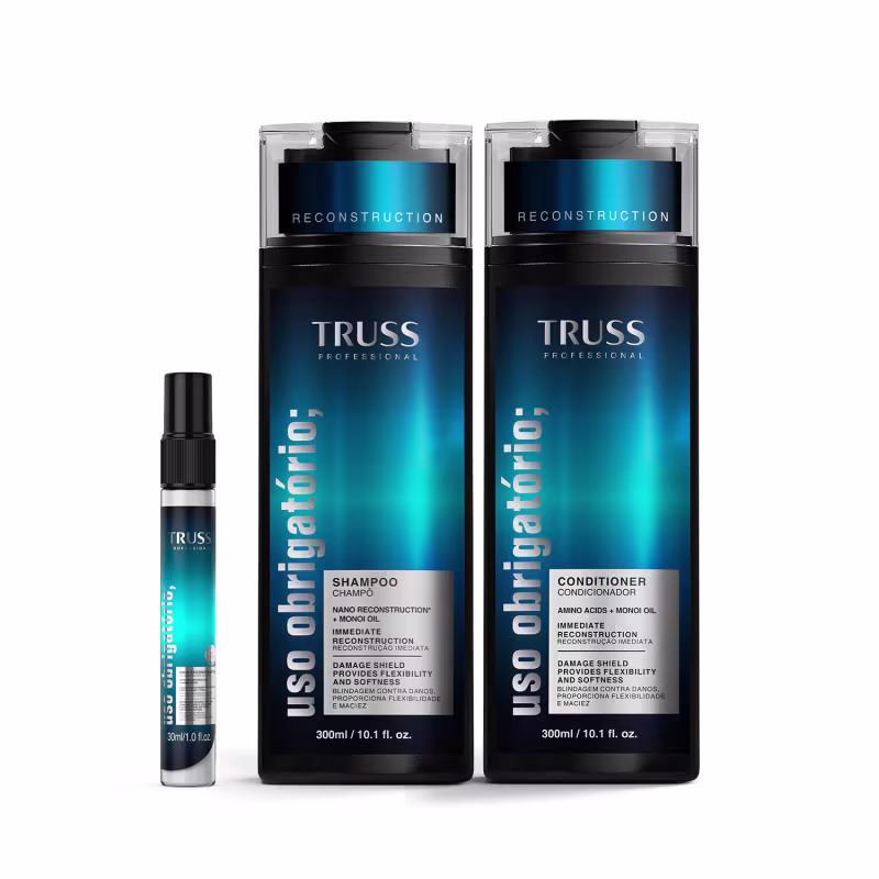 Este combo TRUSS oferece a rotina essencial da linha Uso Obrigatório; em sua versão com fragrância premium, garantindo reconstrução imediata, hidratação profunda e proteção contra os danos diários. A combinação do shampoo, condicionador e spray reconstrói a fibra capilar, promovendo até 87% menos quebra, e combatendo o frizz para restaurar a força e o brilho natural dos fios.