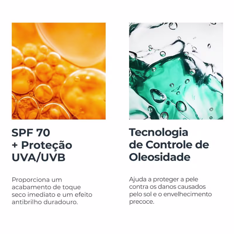 Protetor solar facial que impressiona pela textura leve e gel-creme, controlando o excesso de oleosidade. Ideal para peles com tendência à acne, proporciona toque aveludado, absorção rápida e efeito uniforme sem aspecto esbranquiçado.