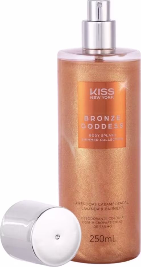 Body splash com fragrância floral gourmand. Kiss New York Shimmer Collection Silver Queen Bronze Goddess deixa a pele com brilho sutil e aroma duradouro.