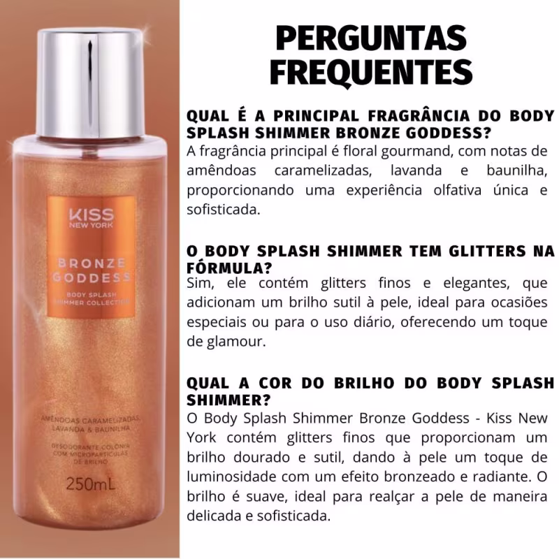 O Body Splash Kiss New York Shimmer Collection Silver Queen Bronze Goddess traz um aroma sofisticado, que envolve a pele com micropartículas de brilho. As notas de lavanda, leite de coco e amêndoas caramelizadas aquecem a pele com um aroma cativante, enquanto o glitter dourado adiciona uma luminosidade delicada. Ideal para quem ama destacar-se com elegância e feminilidade.