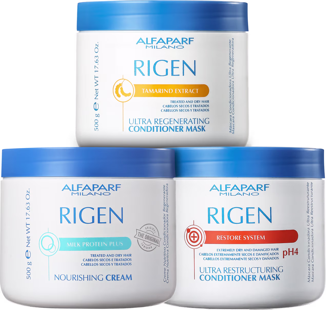 Alfaparf Rigen Restore System - Máscara Capilar 500g: trata profundamente os fios para recuperar a fibra capilar e prevenir contra danos futuros.