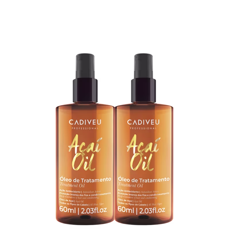 Kit de óleo de tratamento para todos os tipos de cabelo. Versátil e multifuncional, Cadiveu Professional Açaí Oil possui uma fórmula exclusiva que nutre e restaura, além de selar as pontas duplas.