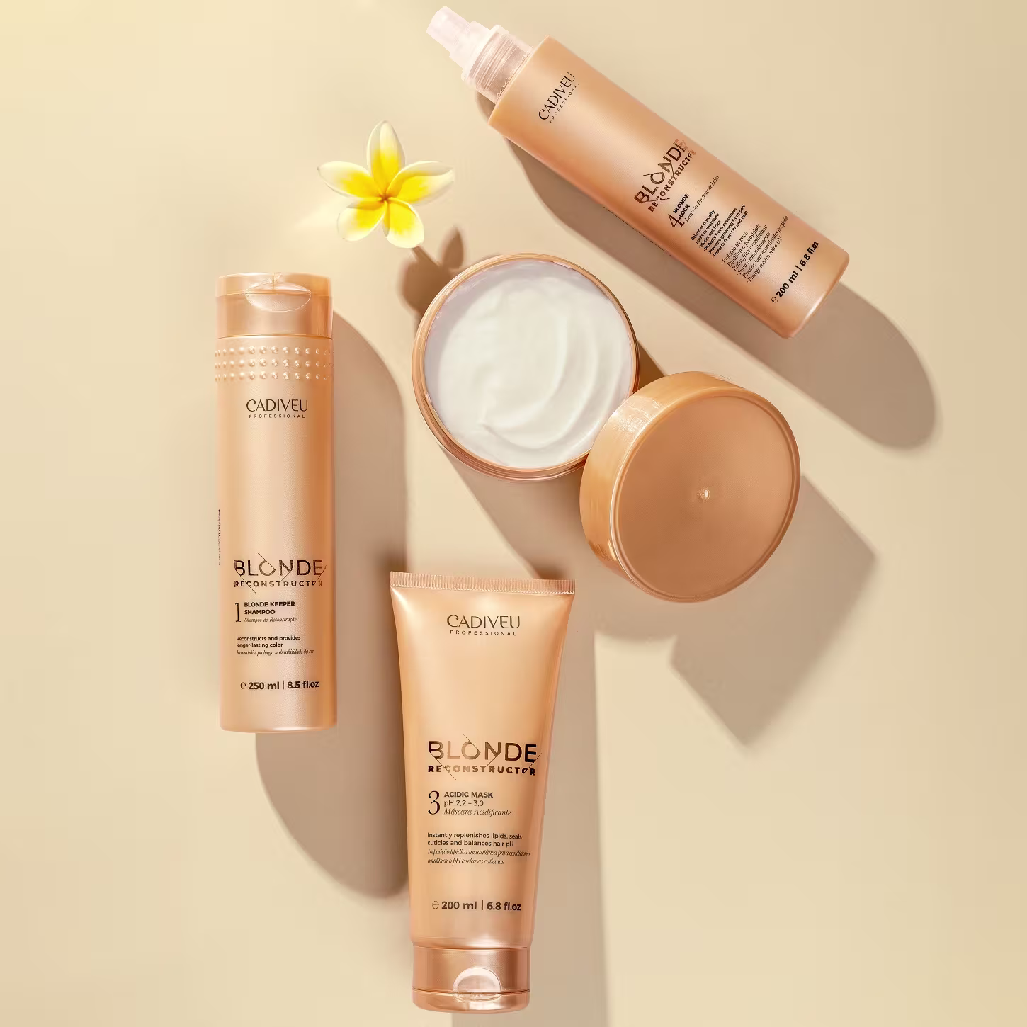 A linha Blonde Reconstructor, de Cadiveu Professional, oferece reposição de lipídeos, massa e proteínas para garantir uma reconstrução profunda, proteção da integridade da cor, maciez e alinhamento dos fios, sendo um tratamento de reconstrução completo para utilização em todas as fases - pré, durante e pós - dos processos de descoloração.