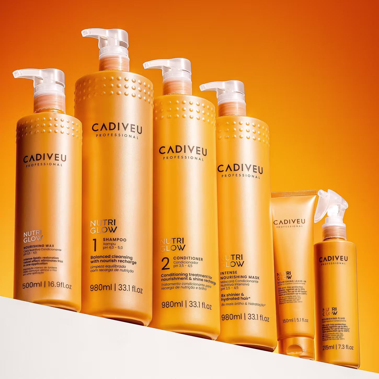 Nutri Glow, de Cadiveu Professional, foi desenvolvida com a exclusiva tecnologia Oil Elixir, um poderoso blend de óleos que repõe os lipídeos das camadas mais profundas da fibra capilar. É uma linha para todos os tipos de cabelos secos, ressecados e sem vida, que atende tanto o fio mais fino quanto o mais grosso, sem pesar. Proporciona nutrição instantânea, 8x mais brilho e proteção antifrizz por 72h. Além disso, apresenta um sensorial olfativo marcante, que eleva o serviço desde o primeiro passo.