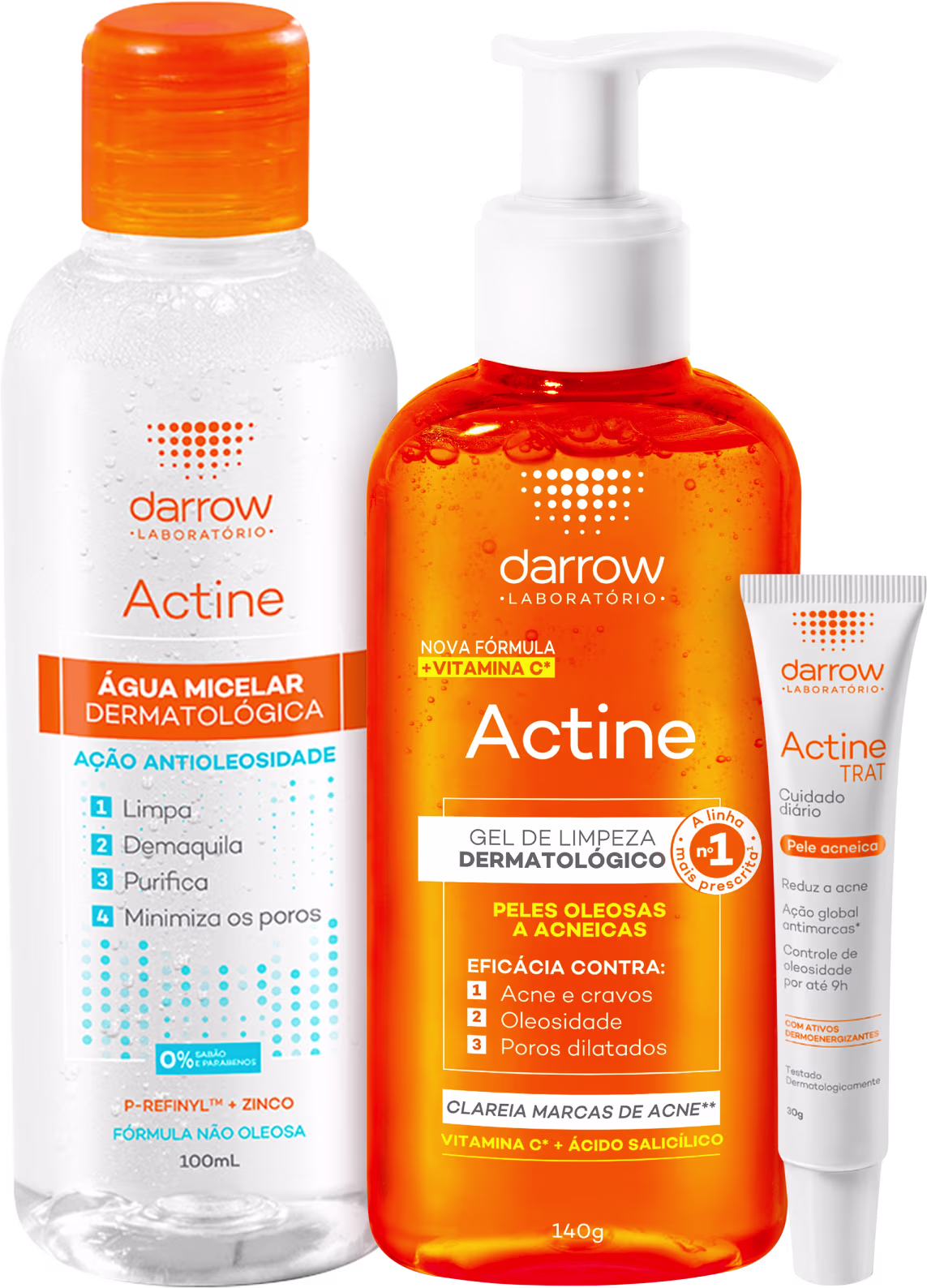 Actine é uma linha Darrow que oferece uma grande variedade de soluções para a pele oleosa e com espinhas, sendo recomendada por 7 em cada 10 dermatologistas.