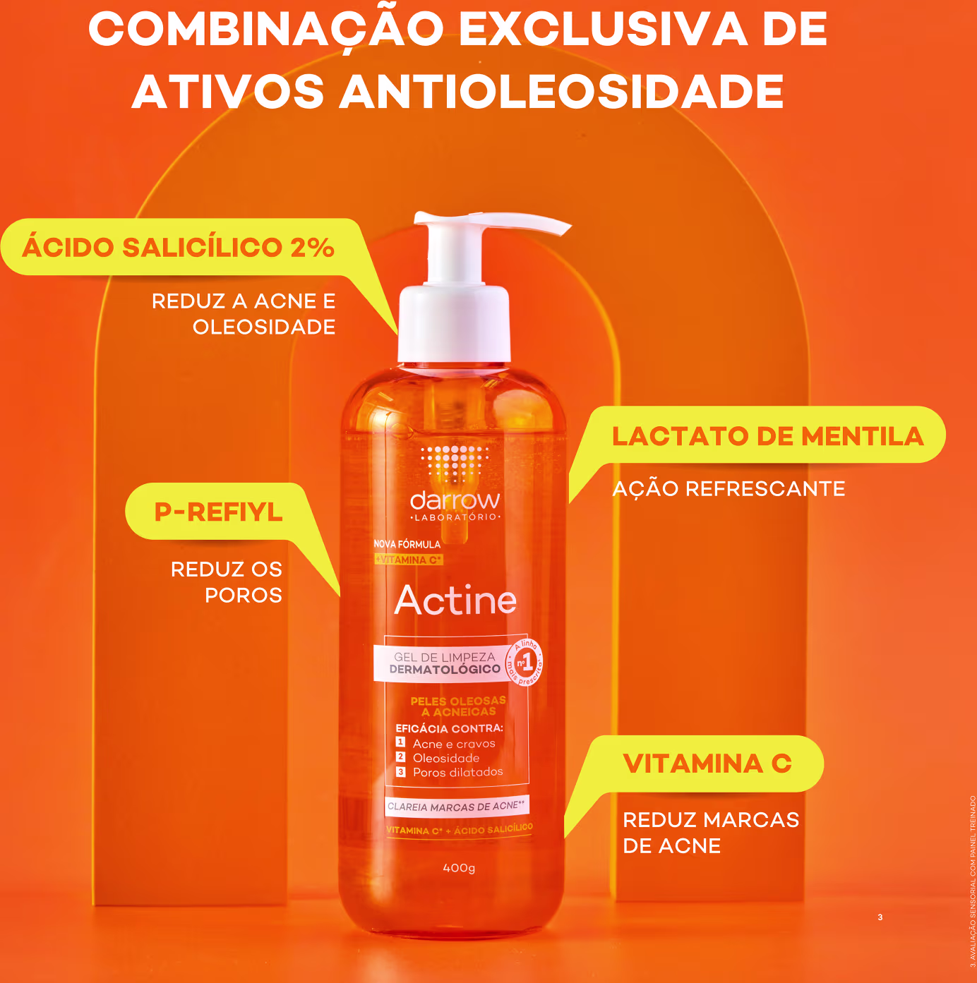 A linha Actine, de Darrow, foi desenvolvida para atender às exigências da pele oleosa e propensa a acne. Recomendada por 7 em cada 10 dermatologistas, essa linha abrangente oferece um extenso portfólio de produtos com texturas leves e refrescantes. Sua formulação é cuidadosamente elaborada com ativos reconhecidos por sua eficácia, proporcionando resultados notáveis desde o primeiro uso.