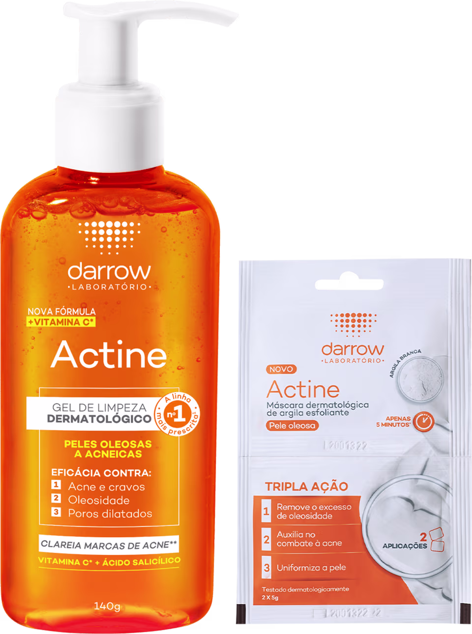 Kit com gel de limpeza e máscaras esfoliantes para pele oleosa. Darrow Actine Vitamina C limpa, combate a oleosidade excessiva e o surgimento de acne.