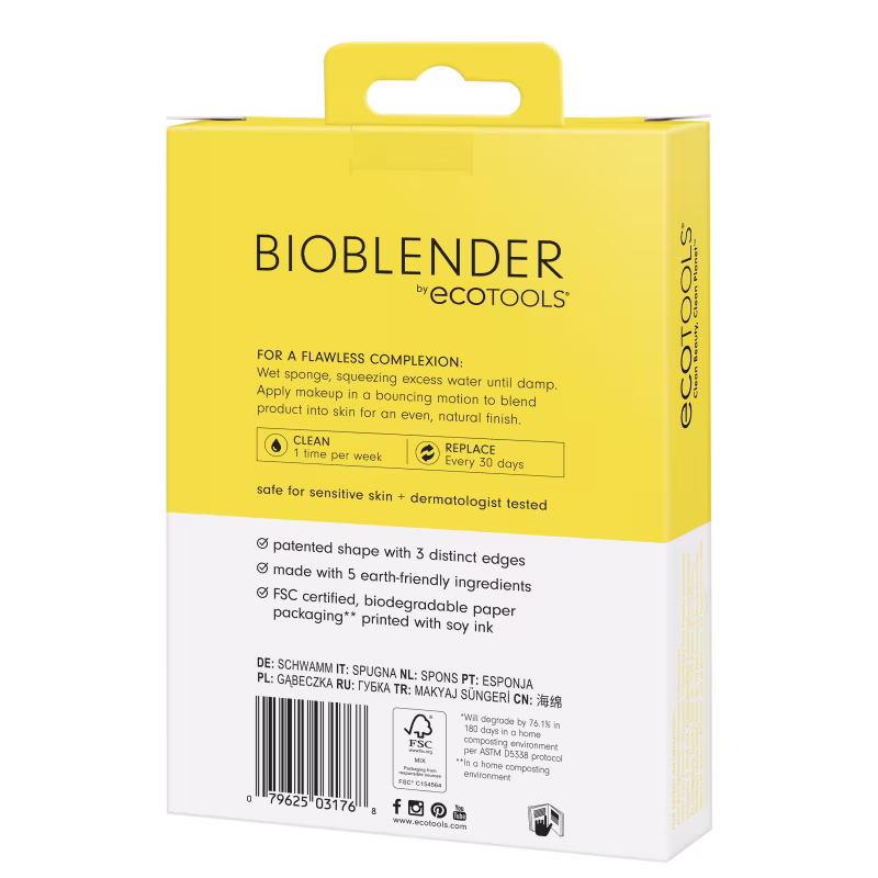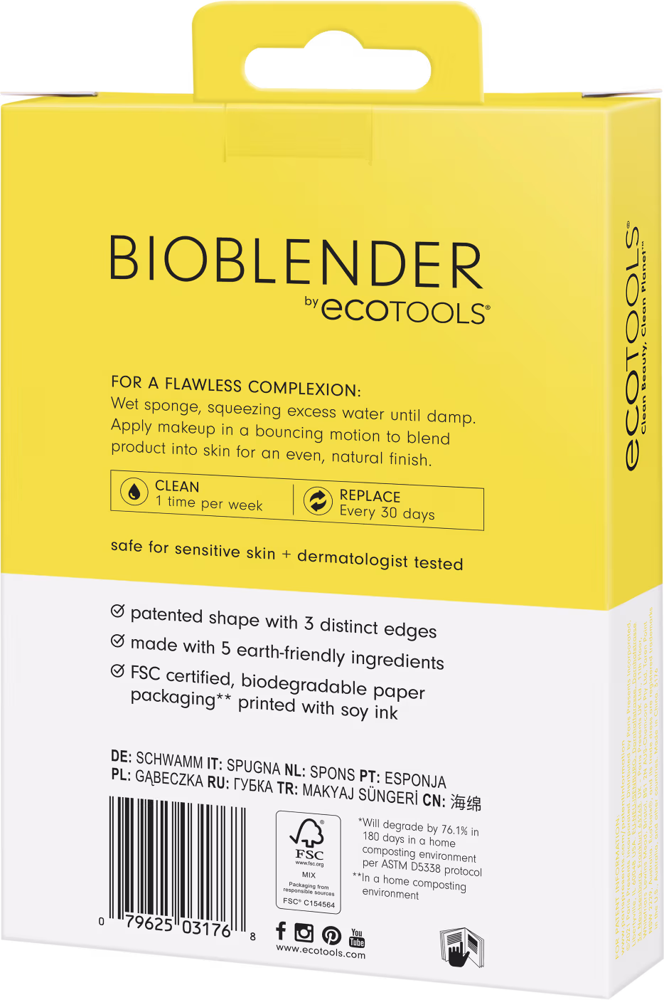 O Kit Ecotools BioBlender Trio apresenta uma textura suave que permite a construção de camadas e um esfumado impecável, além de dispor de uma superfície plana ideal para a aplicação precisa de bases e corretivos em áreas tanto amplas quanto delicadas do rosto. Fabricada com a inovadora tecnologia Ecofoam e livre de látex, sua embalagem é confeccionada em papel biodegradável certificado pelo FSC, impresso com tintas à base de soja. Também é certificado pelo USDA como de origem biológica, vegano e livre de testes em animais.