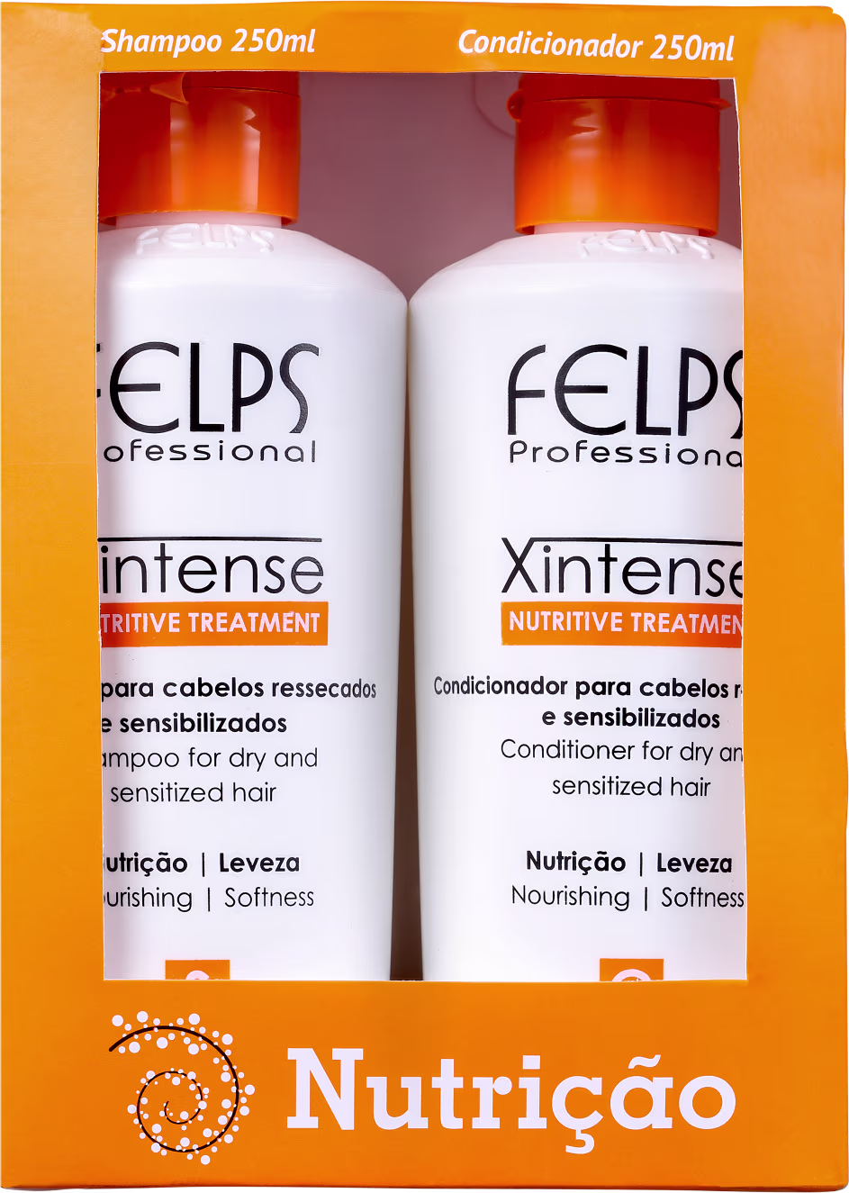 Kit para cabelos ressecados e sensibilizados. Kit Felps Professional XIntense Nutrição Duo confere maciez, leveza e conservação da hidratação da raiz às pontas.