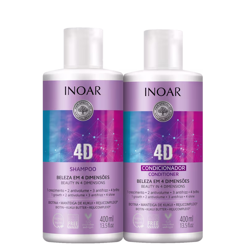 Kit com shampoo e condicionador para cabelos enfraquecidos e que necessitam de reparação intensa. Inoar 4D Duo promove um tratamento em 4 dimensões para atuar no crescimento, antivolume, antifrizz e brilho intenso.