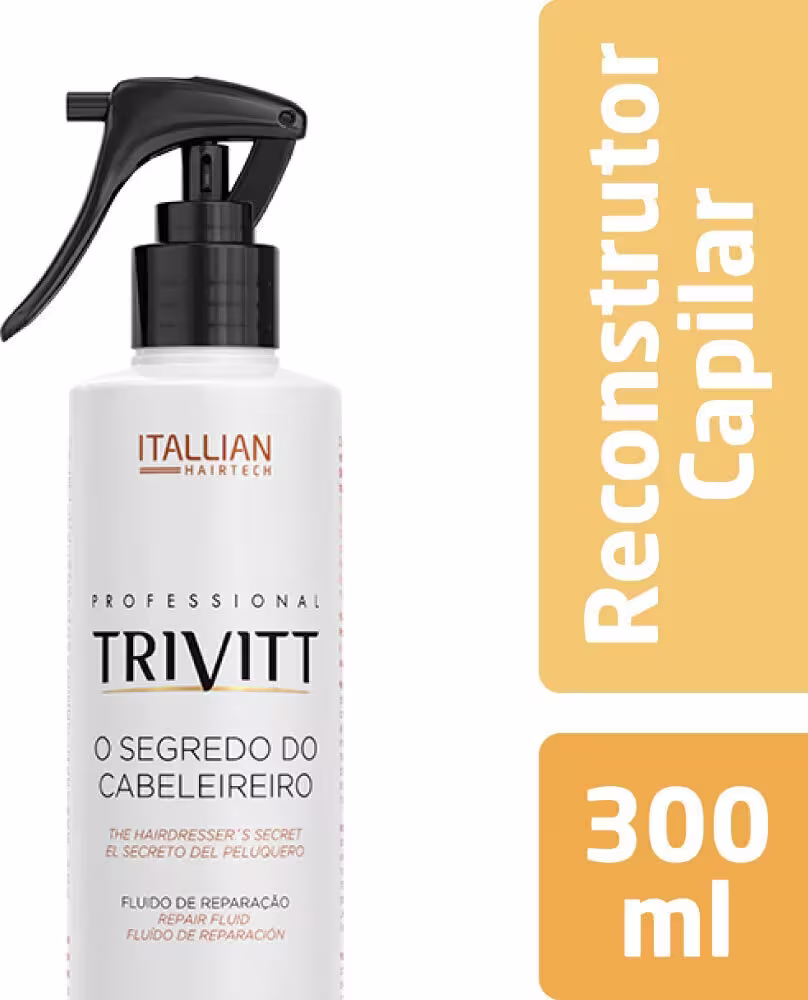 Itallian Hairtech Trivitt O Segredo do Cabeleireiro 300ml: fluido reconstrutor rico em proteínas que reconstrói a estrutura capilar e devolve o alinhamento aos fios.