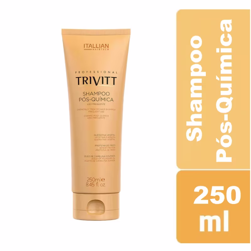 Itallian Hairtech Trivitt Shampoo Pós-Química 280ml: limpa suavemente e auxilia no fechamento das cutículas, mantendo os fios saudáveis e preparados para o tratamento.