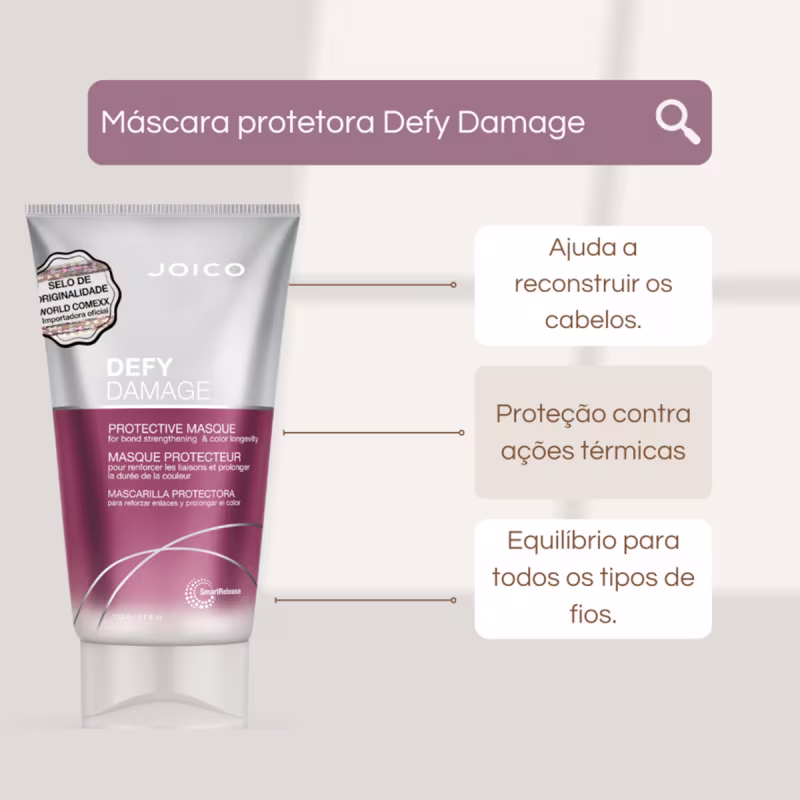 Joico Defy Damage Protective - Máscara 150ml: fortalece a estrutura do fio para evitar danos e quebras. Tem ação profunda que protege o tom do desbotamento e mantém a maciez, o brilho e movimento.