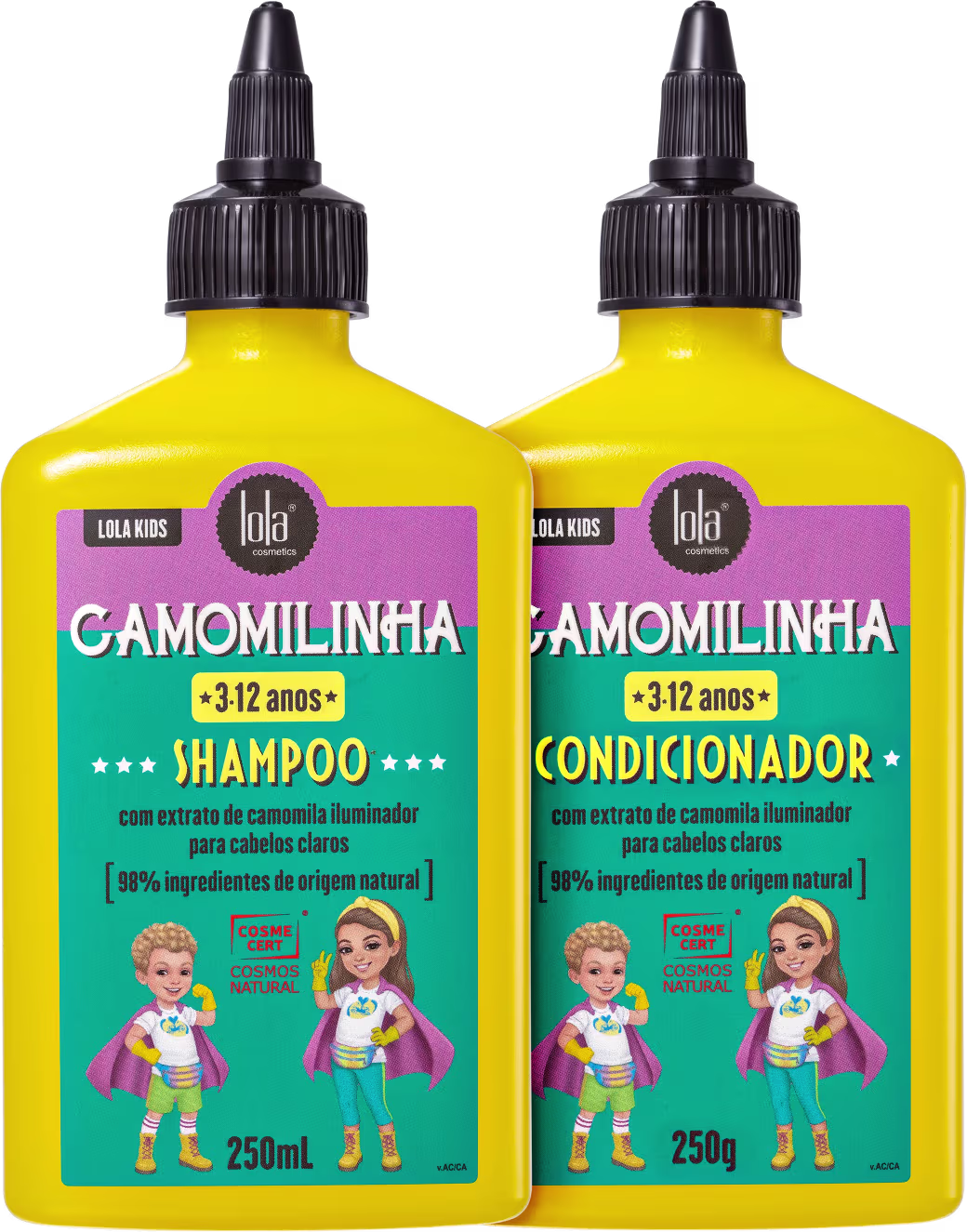 Kit com shampoo e condicionador para cabelos infantis claros ou loiros. Lola Cosmetics Camomilinha Duo limpa e desembaraça os fios.