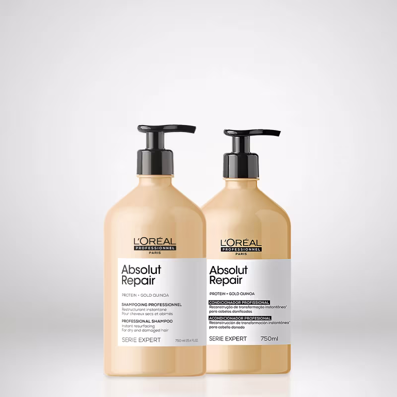 A linha Absolut Repair, da L'Oréal Professionnel, foca em uma reparação instantânea da superfície da fibra capilar. É indicada para cabelos danificados ou muito ressecados. A fórmula com extrato de quinoa dourada e proteína do trigo garante fios mais macios, brilhantes e com toque sedoso.