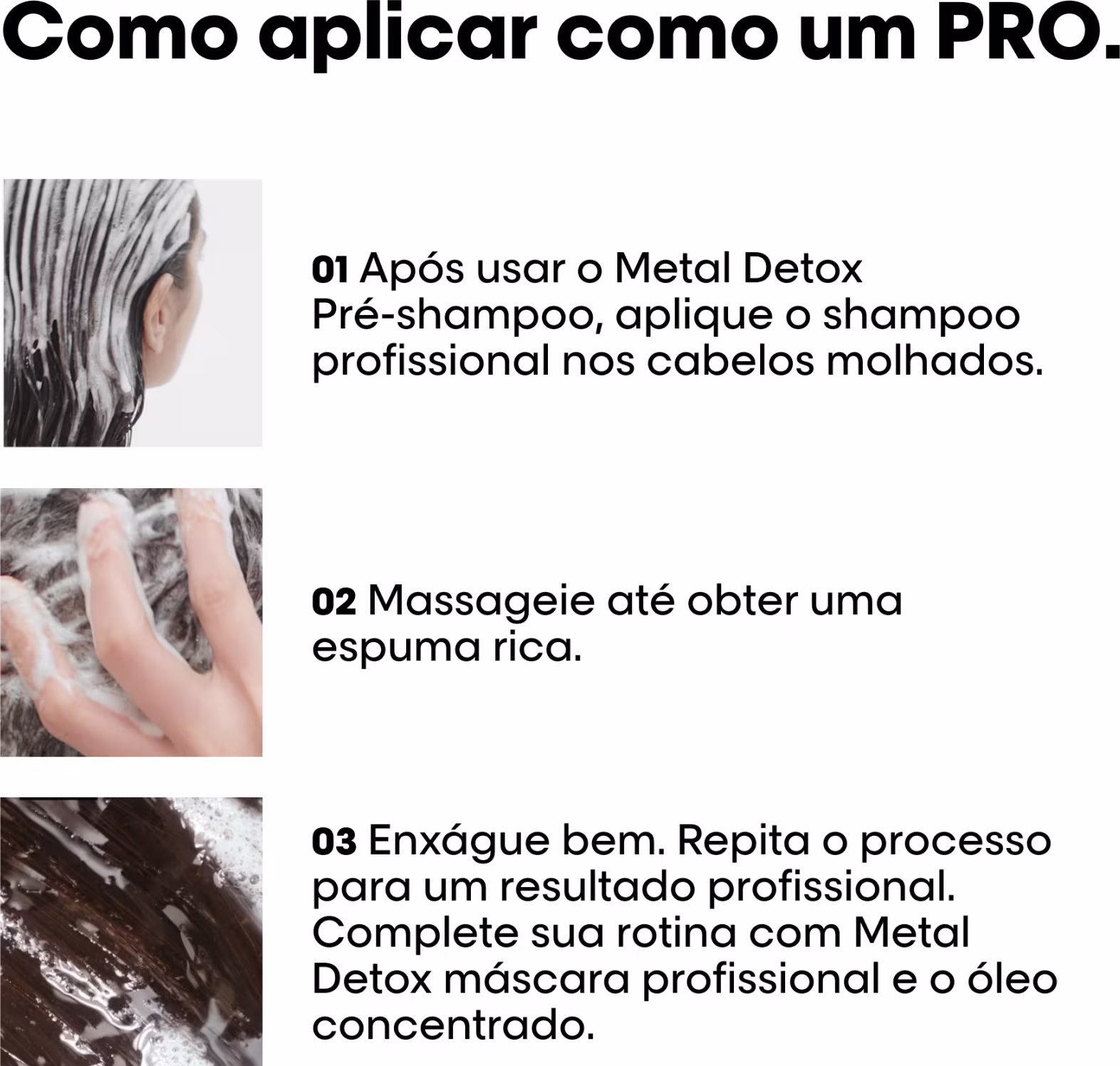 Metal Detox, de L'Oréal Professionnel, traz como principal ação a desintoxicação dos cabelos de metais, aumentando em até 2x o brilho e a durabilidade da cor, além de reduzir a quebra dos fios em até 87%. Traz Glicoamina em sua fórmula, que penetra na fibra capilar neutralizando o excesso de cobre e protegendo a estrutura da fibra capilar. O uso dos produtos neutralizam, desintoxicam e eliminam o metal, impedindo que as partículas voltem para as madeixas.