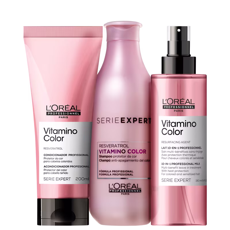 A linha Vitamino Color, de L'Oréal Professionnel, traz a gama de produtos para cuidar dos cabelos com coloração. Formulada com Resveratrol e agentes antioxidantes, protege e potencializa a cor dos fios coloridos.