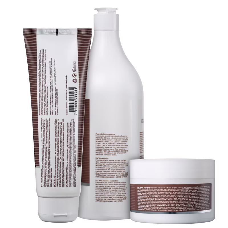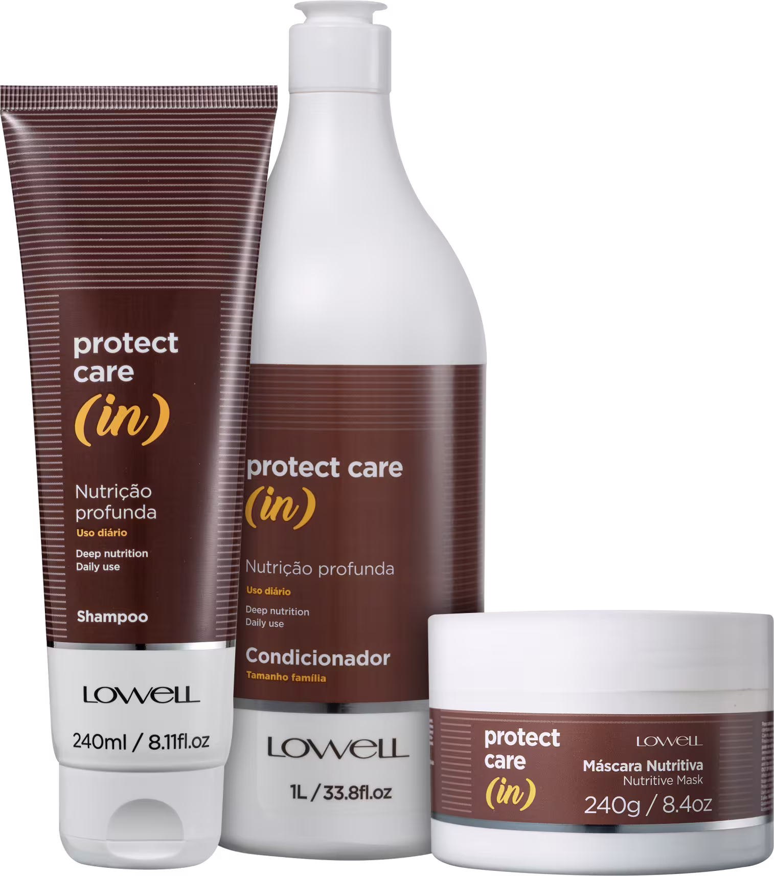 A linha Protect Care, da Lowell, é um tratamento de nutrição profunda para cabelos ressecados, com frizz e sem brilho. Com alta tecnologia, a fórmula oferece a reposição de óleos e vitaminas essenciais para maciez, controle de frizz, e toque acetinado.