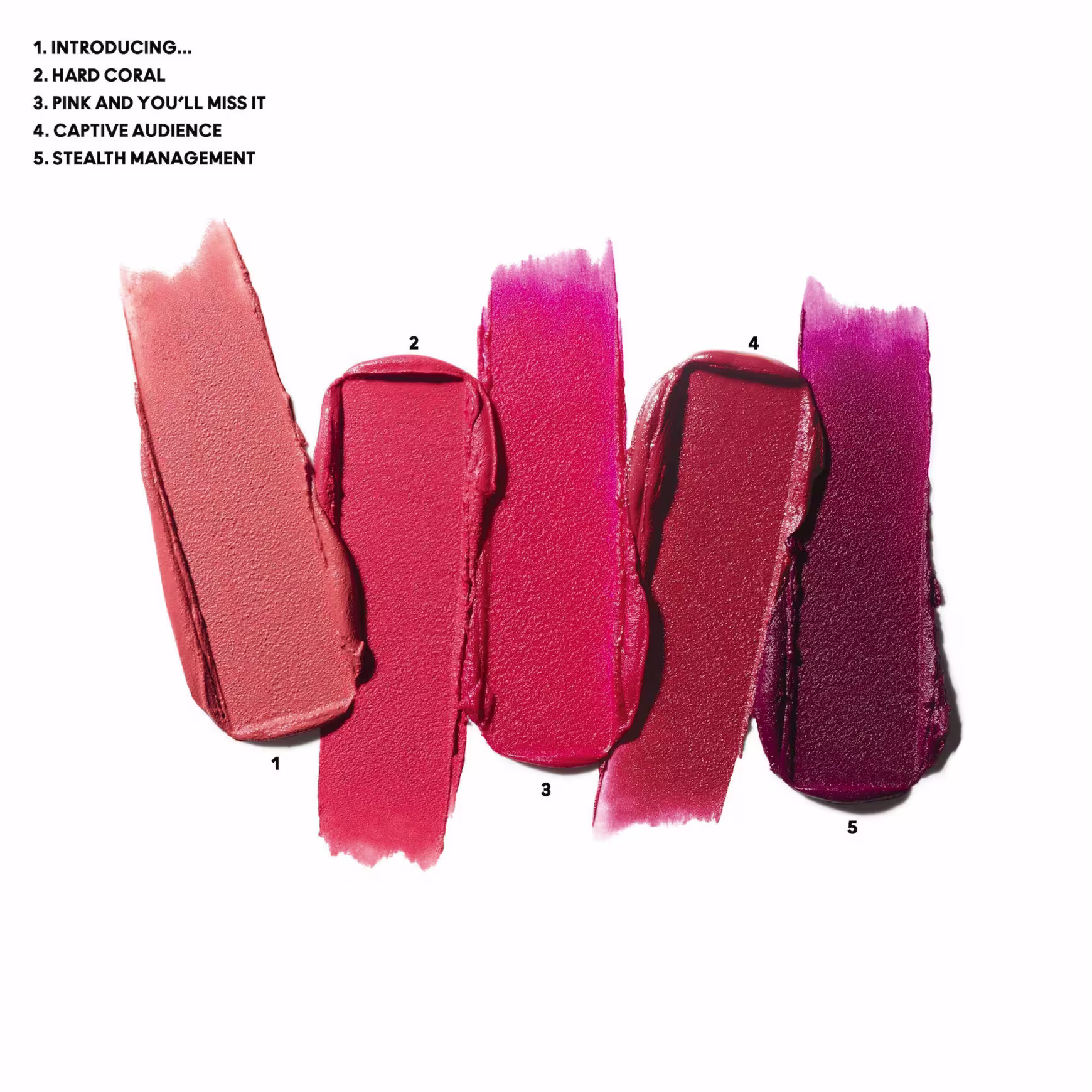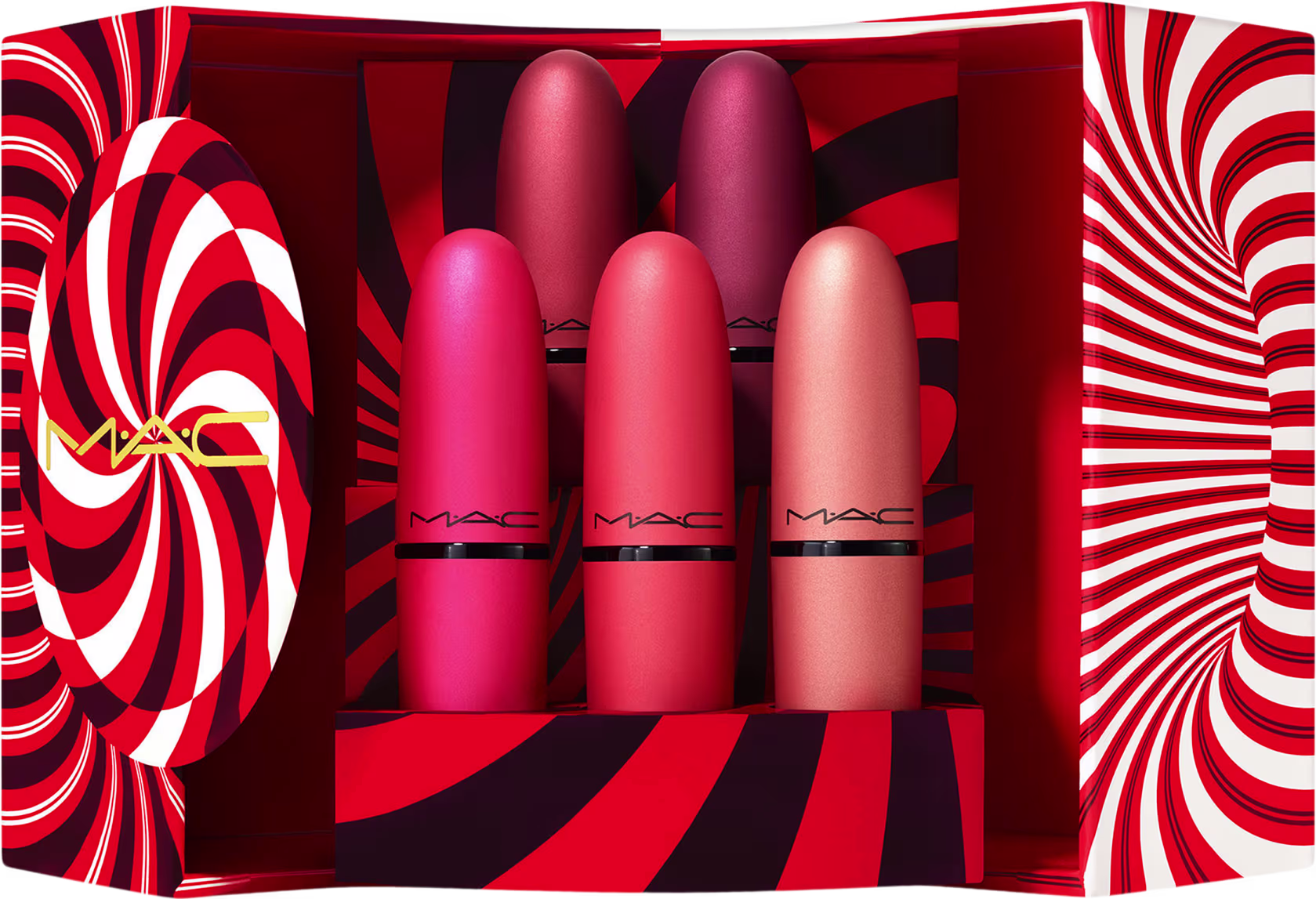 Kit com cinco batons em bala em tons de edição limitada. Com o Kit M·A·C Mistletoe Matte Powder Kiss Lipstick X5 transforme instantaneamente seu look de fim de ano.