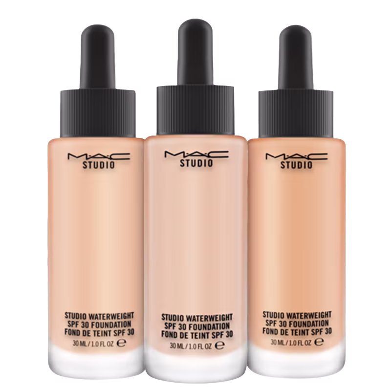 Kit com 3 tons de base. M·A·C Studio Waterweight NW13+ NC25 + NC30 garante uma maquiagem com cobertura uniforme, acabamento acetinado e que hidrata a pele imediatamente.