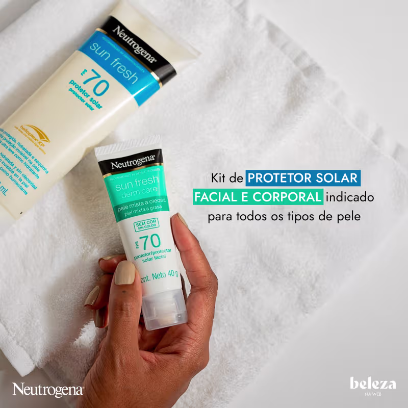 O Kit Neutrogena Sun Fresh FPS70 apresenta fórmulas de textura não oleosa, com toque seco, que promove rápida absorção e conforto durante o uso. Tanto o protetor solar facial quanto o corporal irão manter sua pele hidrata, protegida e fresca durante o dia todo. Indicado por dermatologistas.