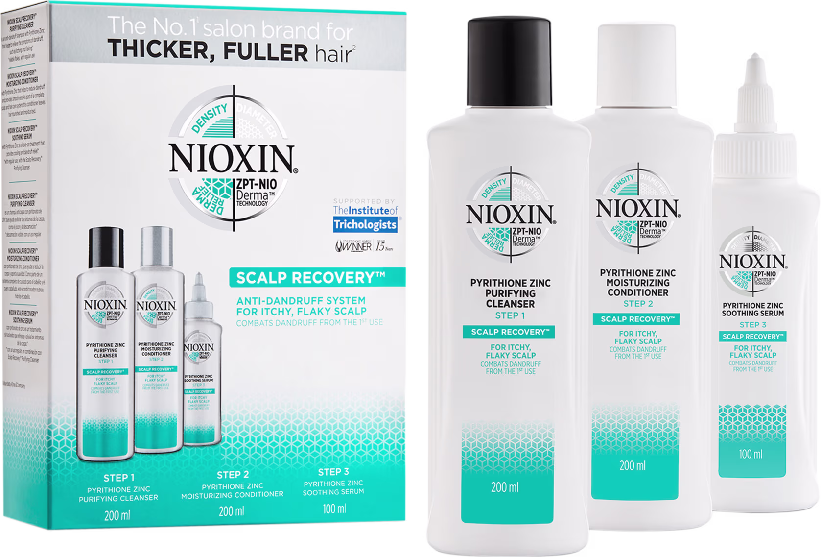 O Kit Nioxin Scalp Recovery combina três produtos que ajudam no alívio da coceira e descamação causadas pela caspa. Além disso, promove uma limpeza purificante, nutre, hidrata e suaviza o cabelo. Ideal para clientes que tem os fios nessas condições.