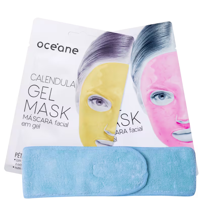 Kit com 2 máscaras faciais e uma faixa de cabelo. Océane Mask Gel Headband proporciona pele revigorada com hidratação potencializada.