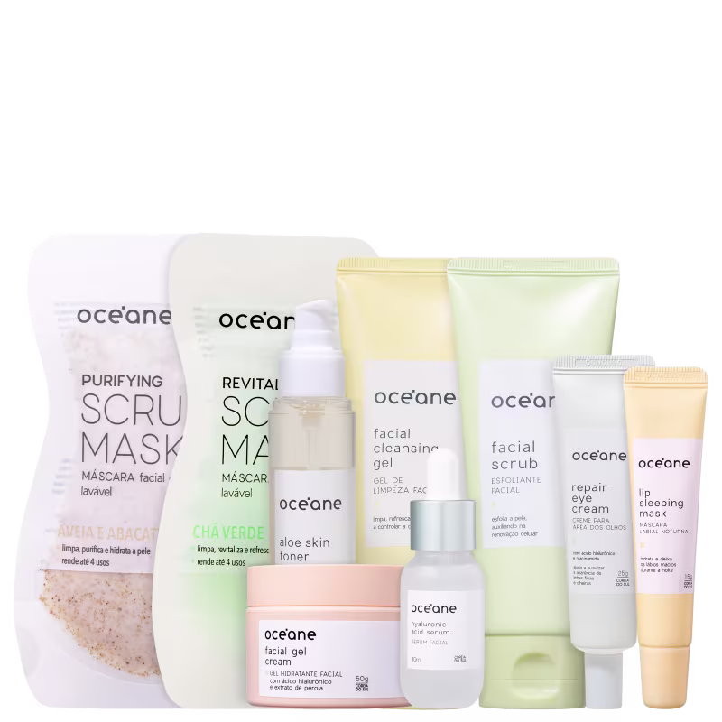 O Kit Océane Revitalizante apresenta uma gama de produtos que abordam os cuidados com a pele desde a fase de limpeza até o tratamento de rugas e linhas de expressão, contribuindo para um skincare poderoso do começo ao fim.