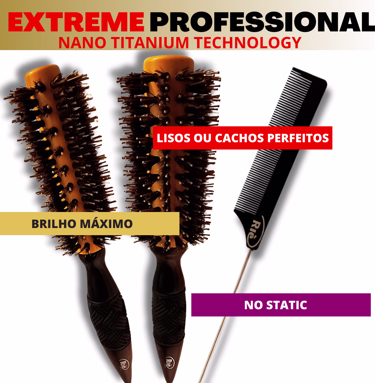 Kit Riè Salon-Pro Extreme Professional é o conjunto para profissionais e entusiastas que buscam a perfeição na escovação. Unindo a tecnologia de Nano Titanium com a tradição das cerdas de javali, este kit foi projetado para cabelos crespos e ondulados, proporcionando um ainhamento, brilho espelhado e durabilidade extrema na modelagem.