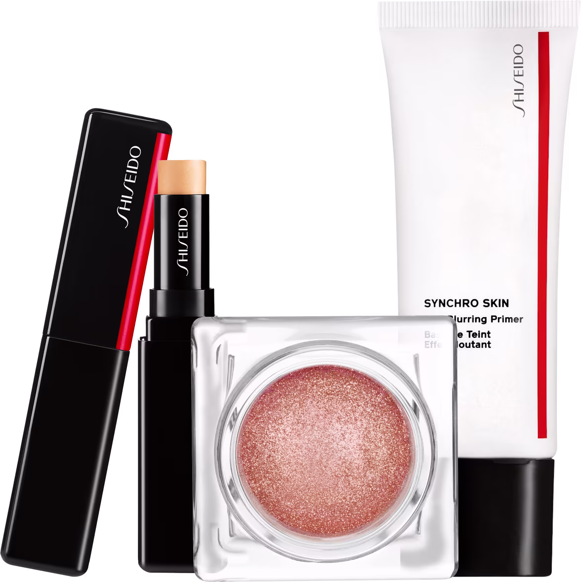 Kit com iluminador, corretivo em bastão e primer facial. Shiseido Skin Correcting Cosmic 102 entrega uma aparência radiante e mais uniforme na maquiagem, de maneira natural e com efeito duradouro.