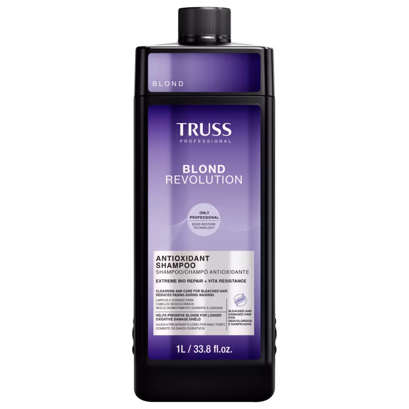 Blond Revolution, de TRUSS, entrega resultados visíveis, protegendo a fibra capilar contra novos danos e prolongando a intensidade da cor. É ideal para profissionais que desejam proporcionar loiros intensos e radiantes.