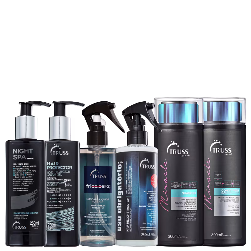 Kit TRUSS Miracle + Uso Obrigatório + Frizz Zero + Hair Protector + Night Spa: um tratamento completo para os fios. Melhores Kits de TRUSS na BLZ PRO. Ver mais ❯