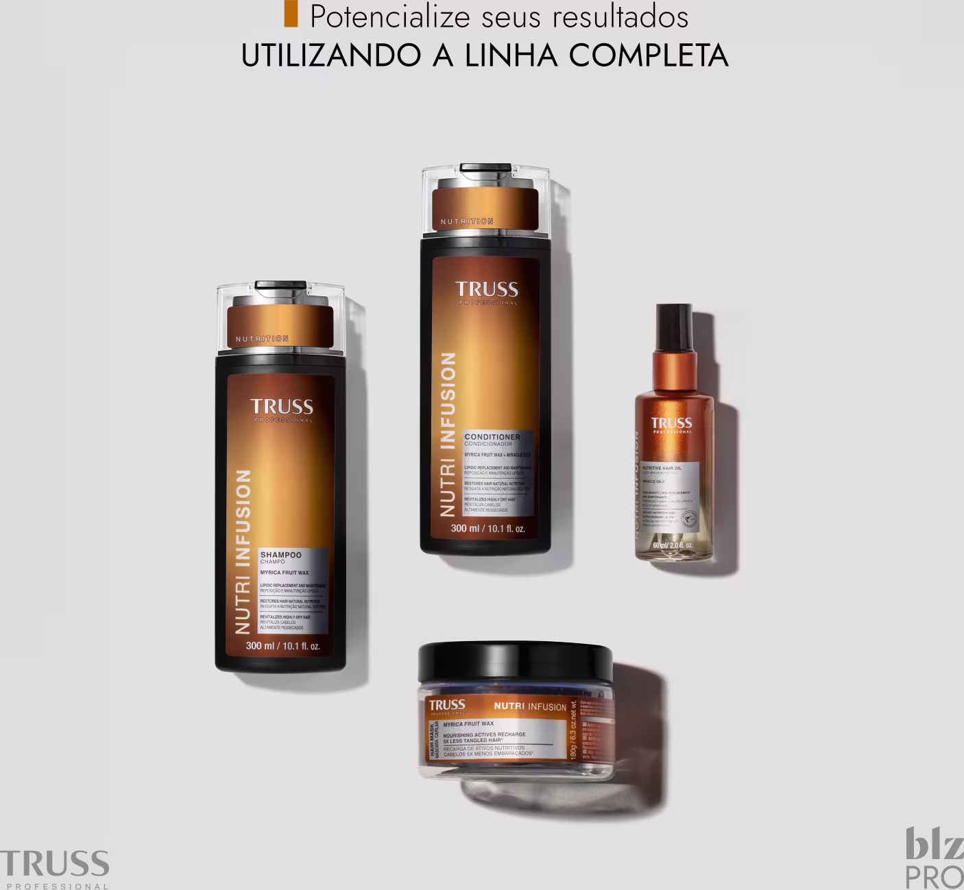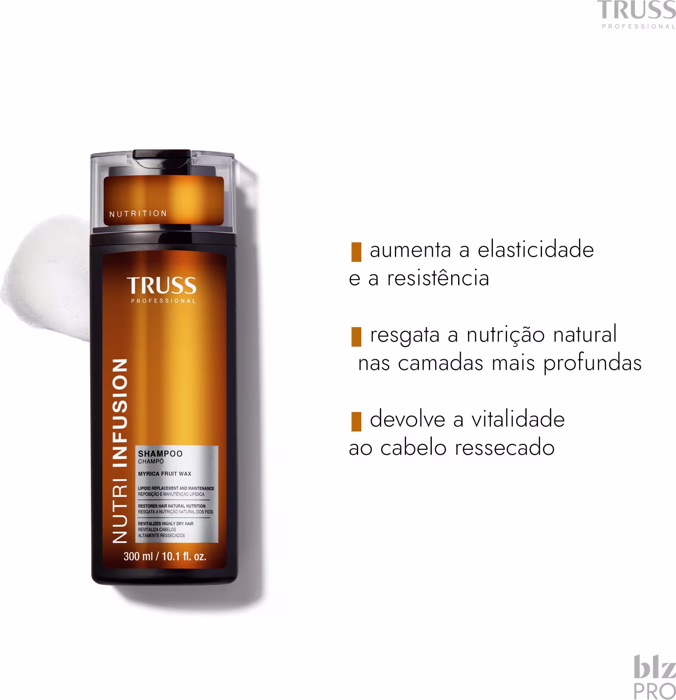 Nutri Infusion, de Truss, é enriquecida com ingredientes de alta performance, como Myrica Fruit Wax e Miracle Oils, que fortalecem a estrutura capilar, melhoram a elasticidade e protegem contra o ressecamento. Seu uso proporciona cabelos macios, luminosos e revitalizados.